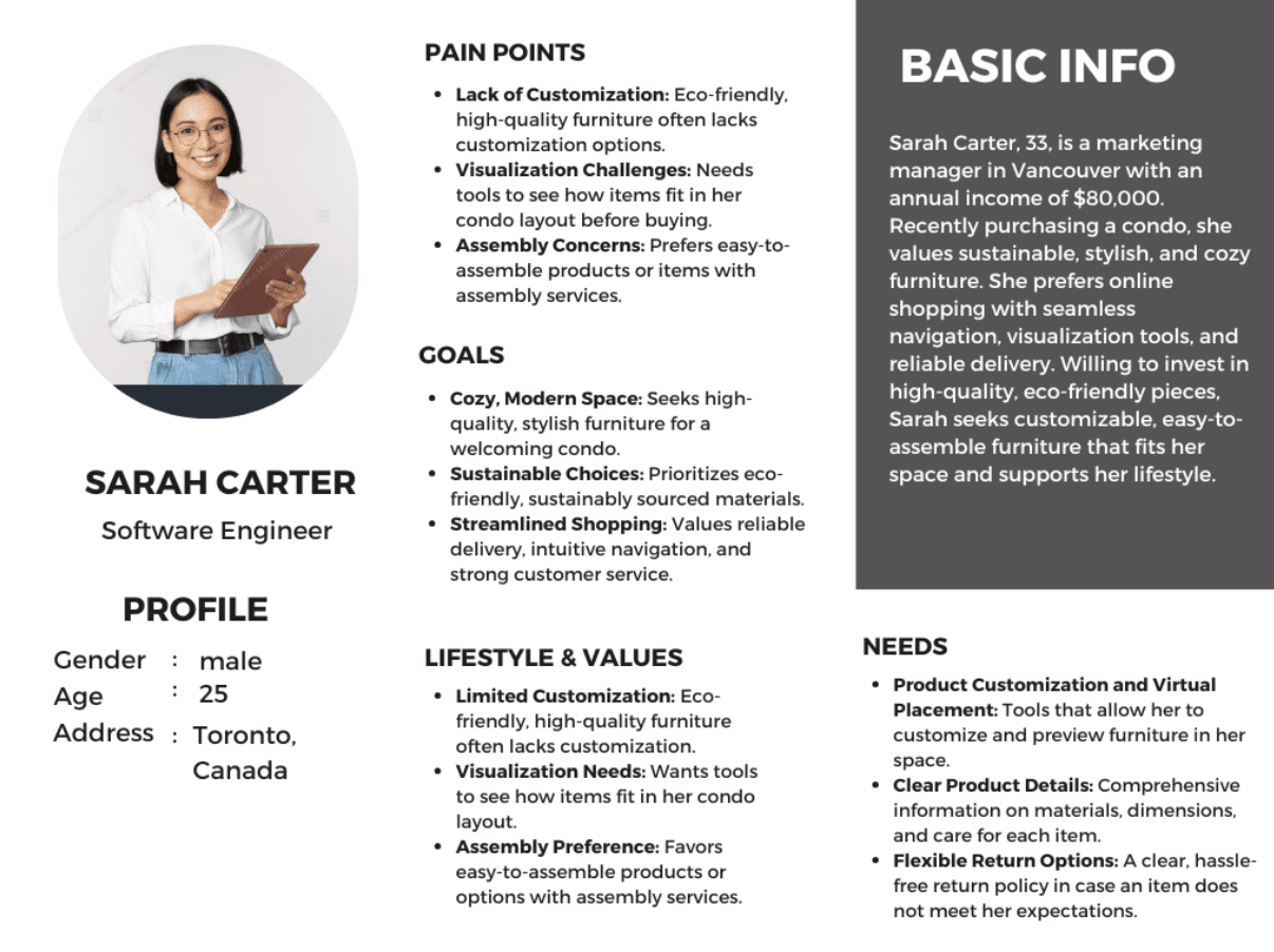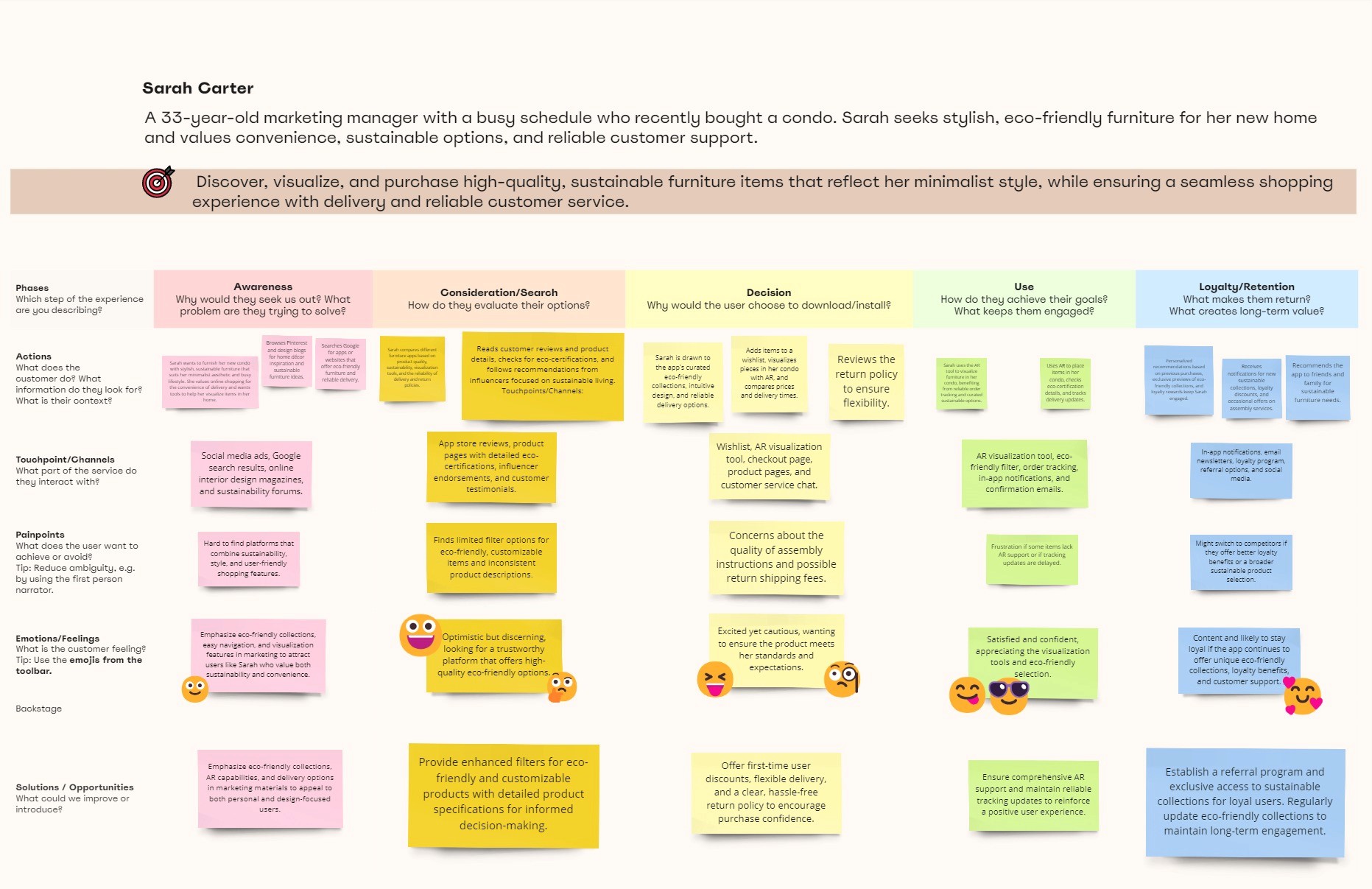 The journey map explores Sarah Carter's experience as a marketing manager seeking stylish, eco-friendly furniture for her new condo. It outlines her interactions across five stages—awareness, consideration, decision, use, and loyalty—highlighting her needs, touchpoints, pain points, and emotions. The map emphasizes opportunities to enhance her shopping experience with AR tools, detailed product information, and personalized eco-conscious options, ensuring a seamless, satisfying, and engaging user journey.