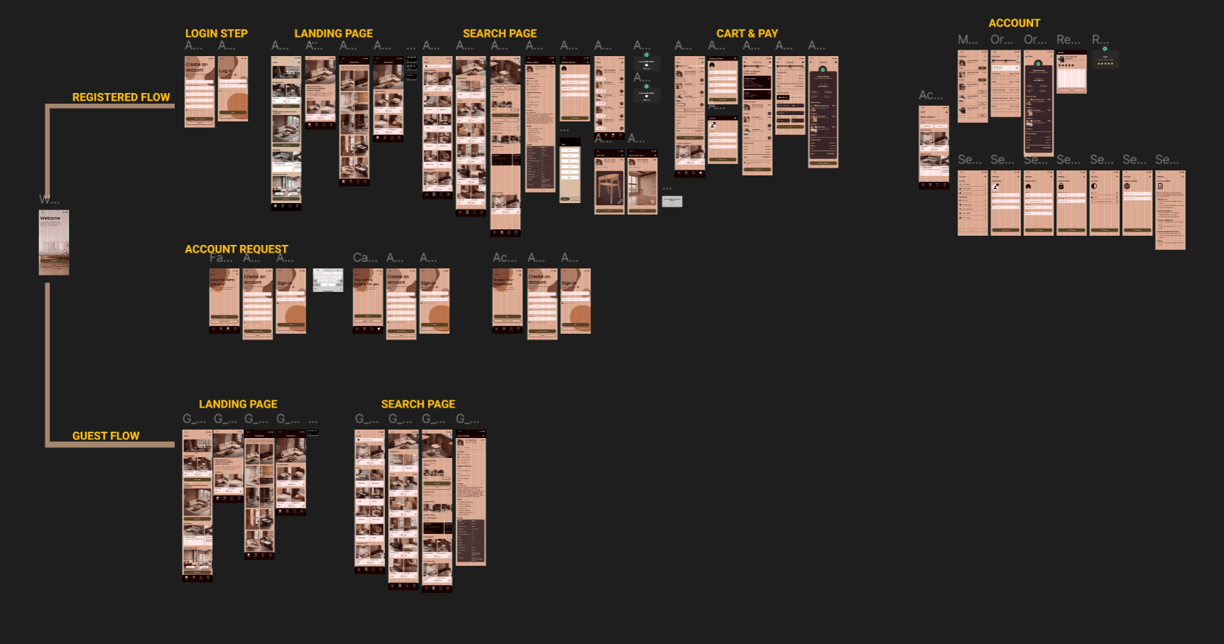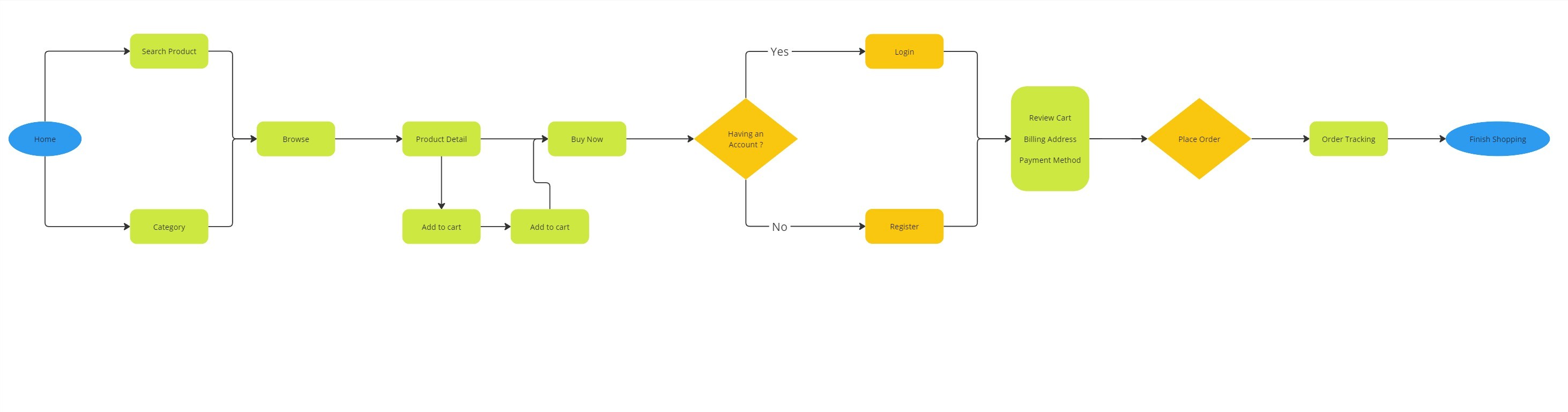 The user flow diagram illustrates how users interact with the HOME app, from exploring furniture categories and visualizing items in their space using AR to customizing products and completing purchases. It maps out clear steps for seamless navigation, ensuring an intuitive and efficient shopping experience for users.