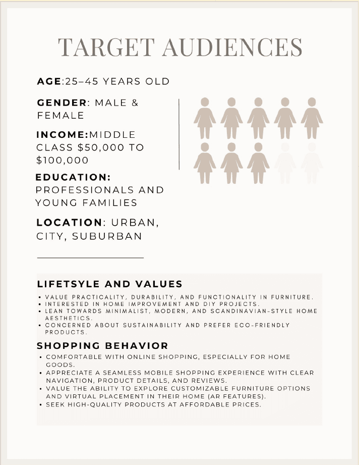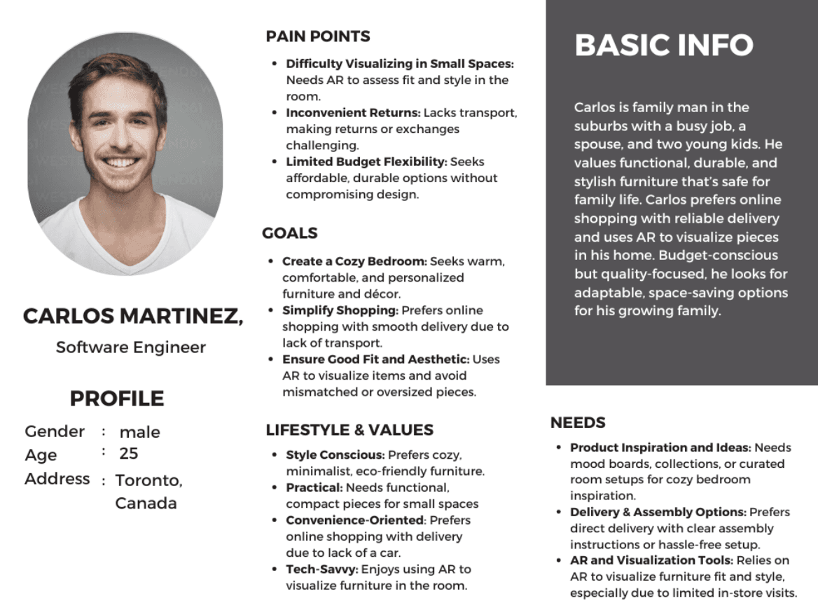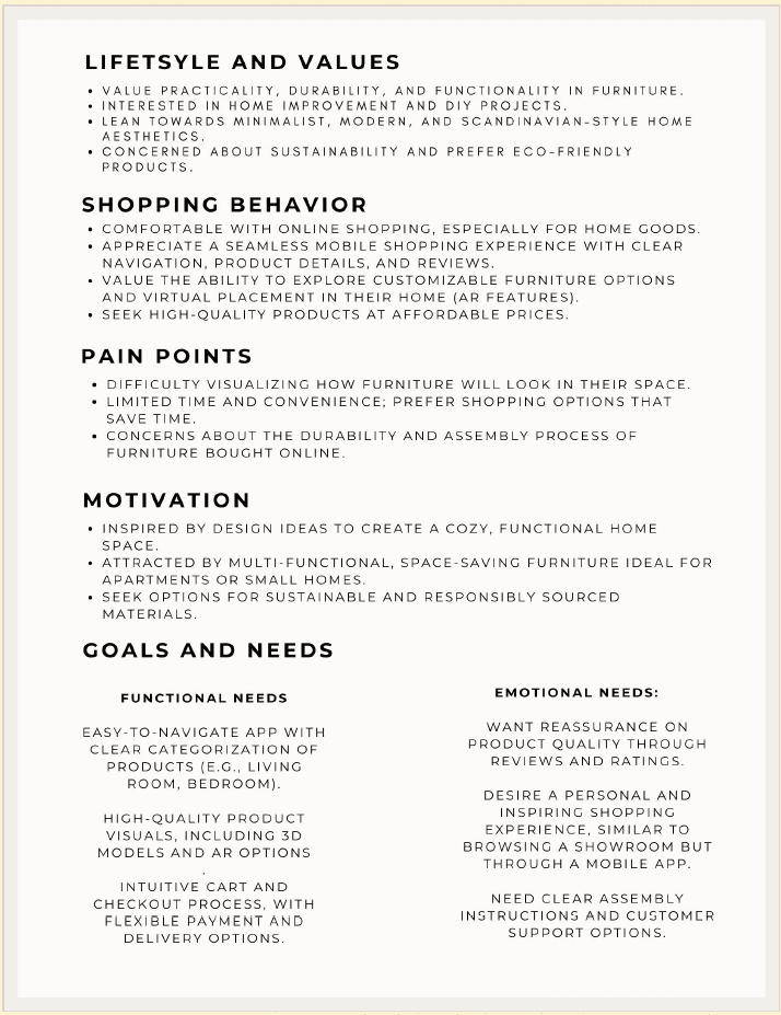 This native iOS app transforms furniture shopping by addressing challenges like overwhelming options, difficulty visualizing furniture in spaces, and inconvenient navigation. Featuring AR tools for real-space visualization, furniture customization, and seamless navigation, the app offers a user-friendly, eco-conscious experience. Inspired by industry leaders, it prioritizes usability and innovation, providing room mockups, robust search functionality, and clear product information for a more intuitive shopping journey.