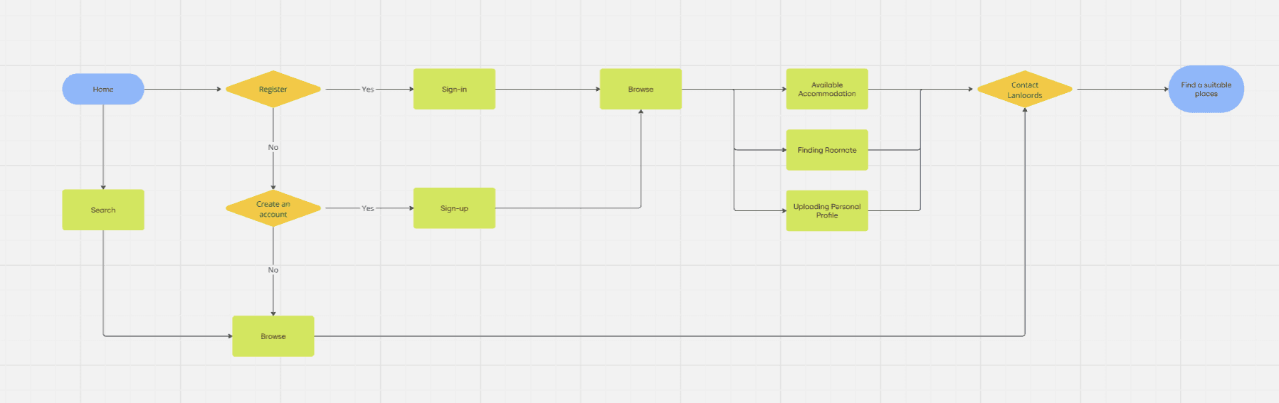 I made this user flow chart to outlines how users navigate Places4Students, from searching or signing in to browsing accommodations, finding roommates, or uploading profiles. It ensures clear steps to access features like contacting landlords and finding housing.