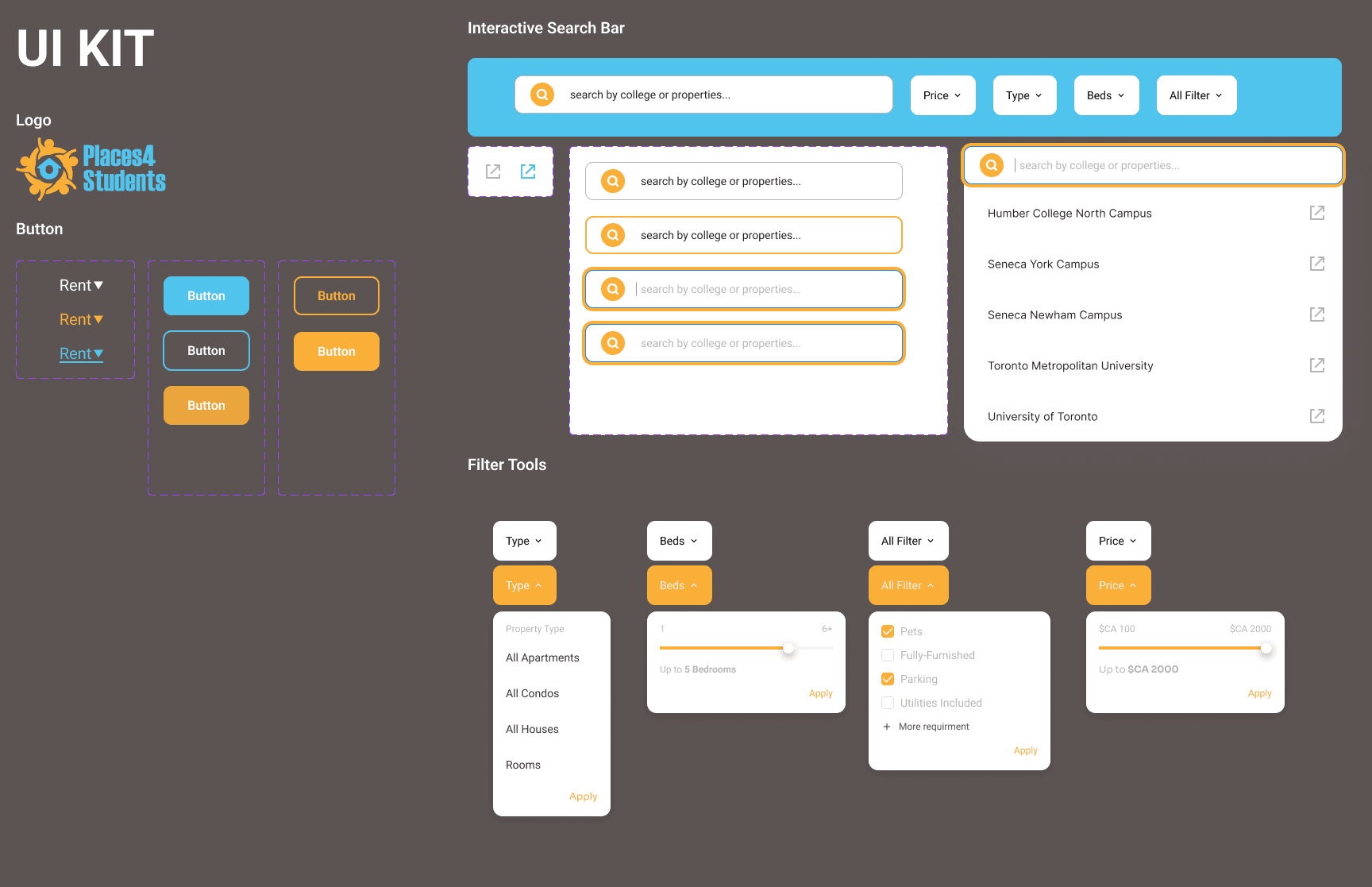 To prepare for the hi-fi prototype, I developed a cohesive UI kit featuring interactive components such as dropdown lists, filter buttons, and search tools with recommendation functionality. Additionally, I refined the logo design to ensure visual consistency and enhance the overall user experience.