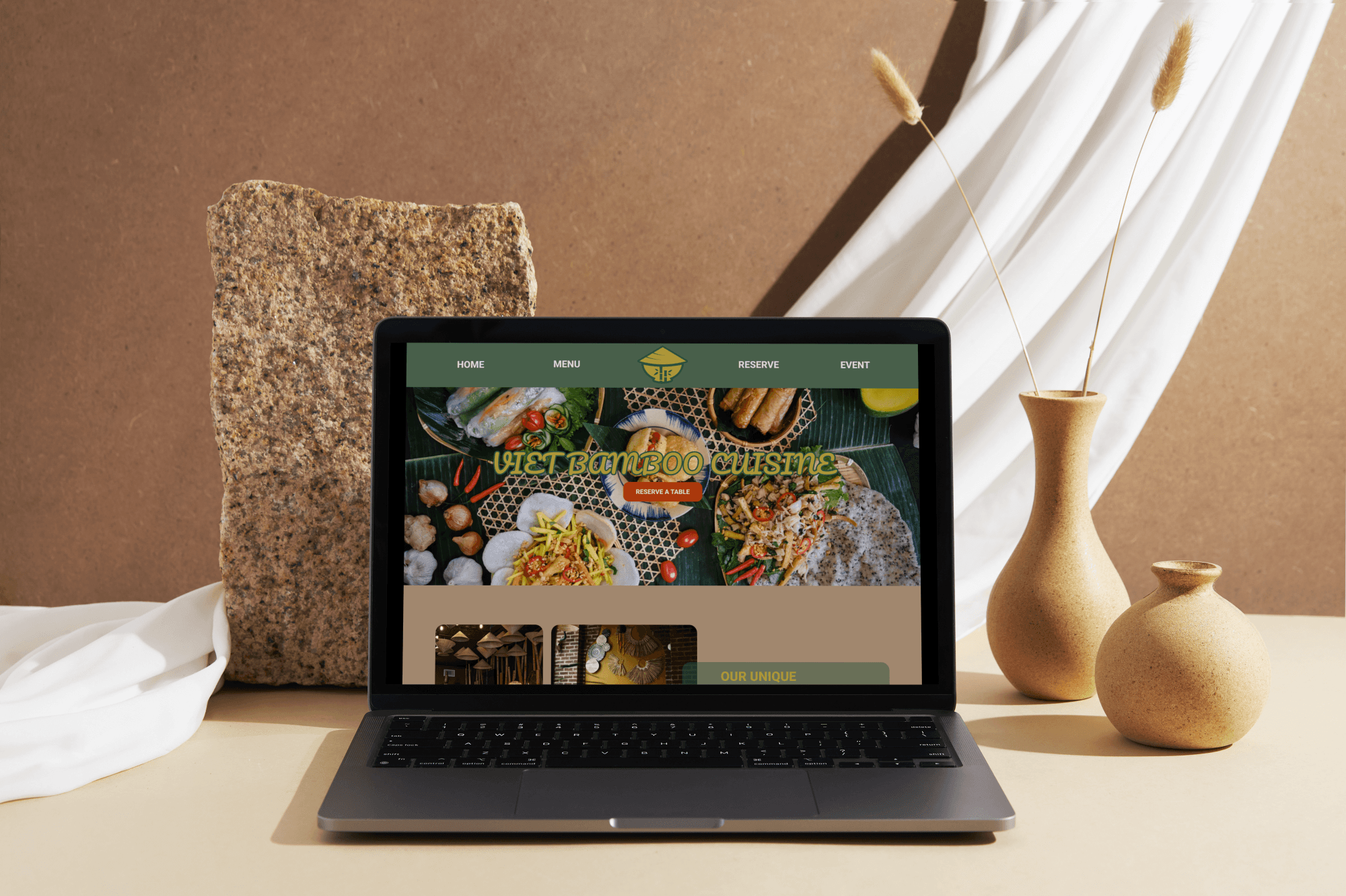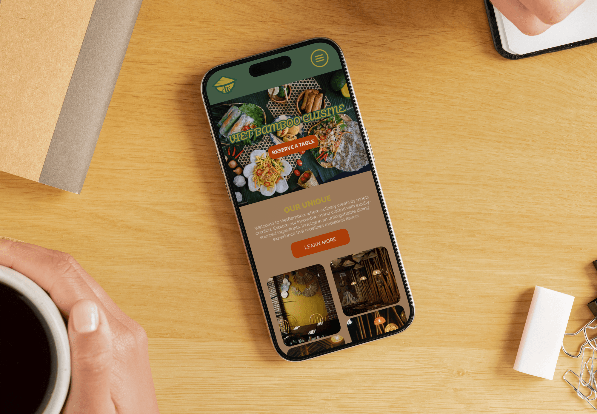 The desktop version offers a spacious, visually rich layout that highlights VietBamboo’s charm, with intuitive navigation for menu browsing and reservations.