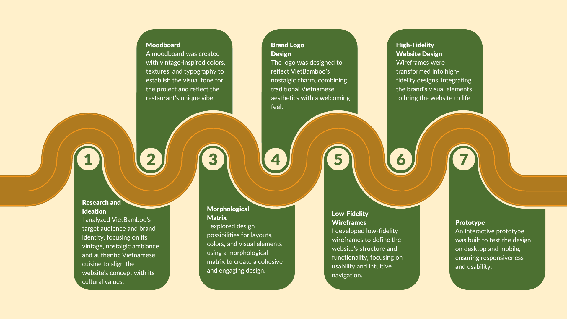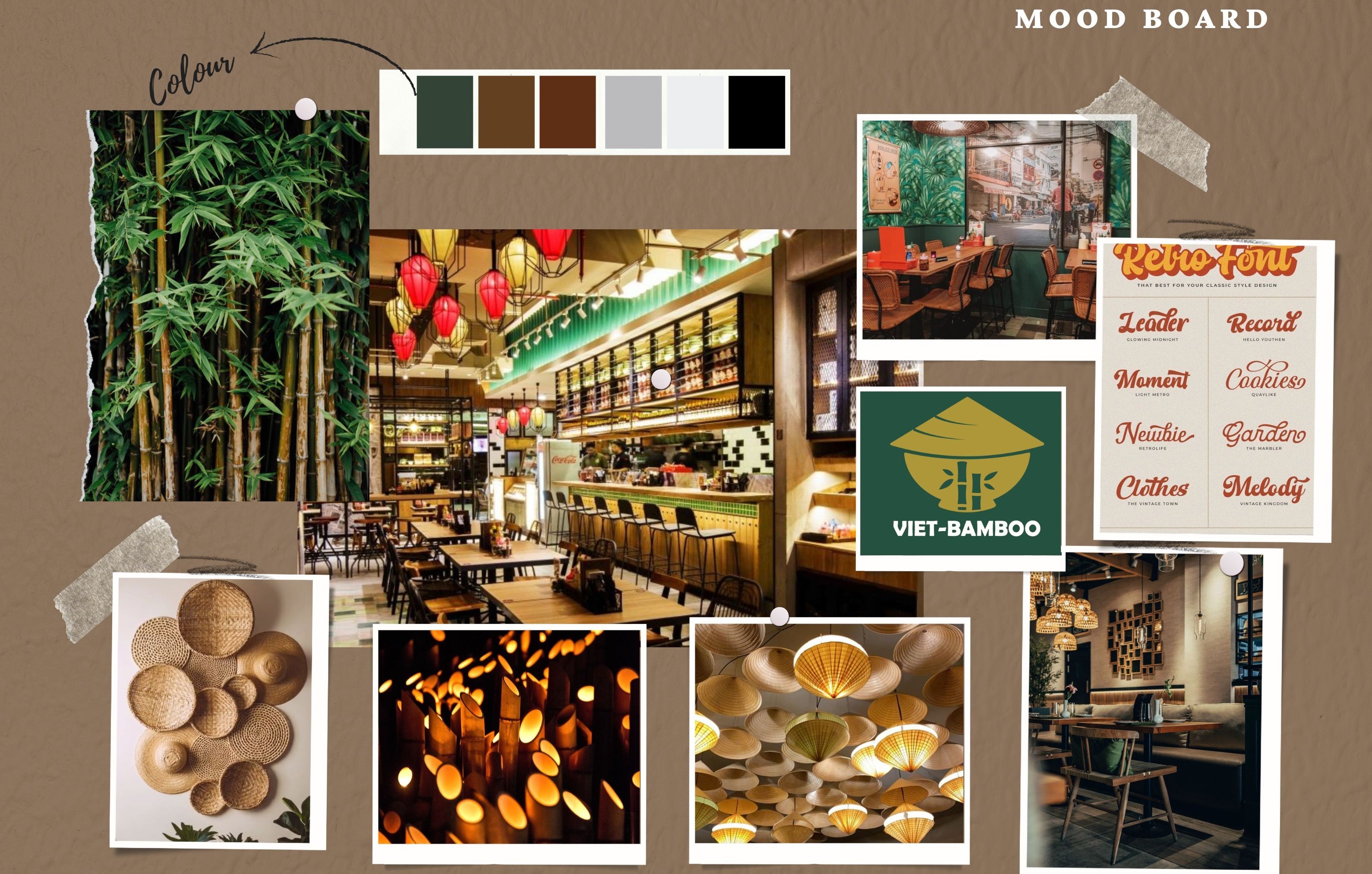 The moodboard captures VietBamboo’s nostalgic and cultural essence through a vintage-inspired color palette, traditional textures, and elegant typography. It reflects the restaurant’s warm and inviting ambiance, setting the visual tone for the website to align with its authentic Vietnamese identity.